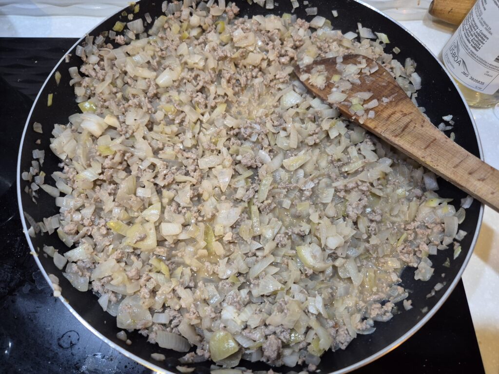 Podsmażamy cebulkę, i dodajemy mięso. Po kilku minutach zaczynamy stopniowo dolewać wino. Pod koniec smażenia dodajemy przyprawy do smaku.