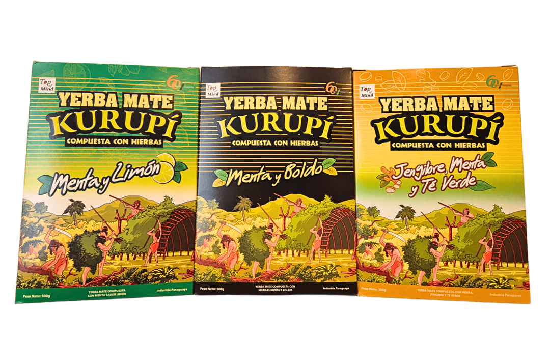 Zestaw 3 opakowań yerba mate Kurupi z Paragwaju – orzeźwiające, ziołowo-owocowe smaki: mięta, cytryna, boldo, imbir i zielona herbata. Idealne także na zimno.